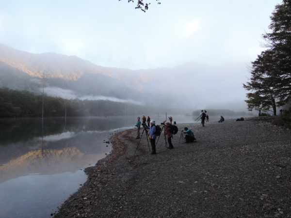 清晨的大正池,朝霧籠罩著,形成夢幻般的景象