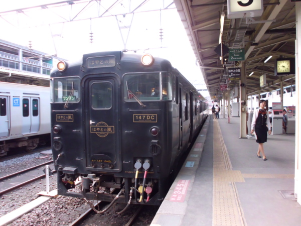 首先搭乘肥薩線的特急隼人之風(はやとの風),連結鹿兒島中央站至吉松,馳騁於霧島山巒之間的隼人之風號列車,行徑數條隱幽的名勝路線,沿途也欣賞到櫻島與美麗的海景。