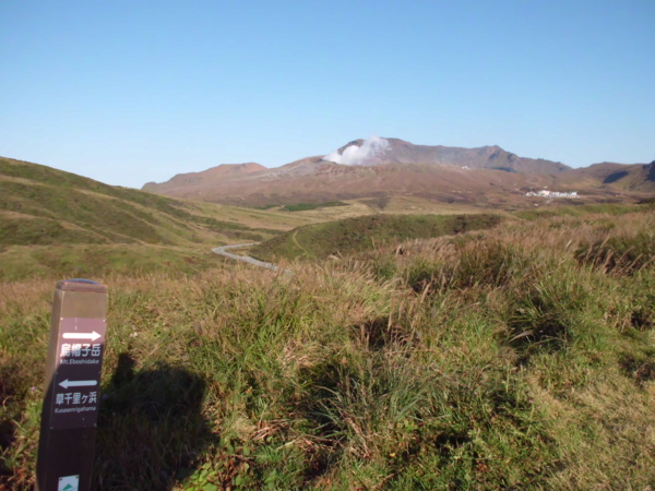再搭巴士往下到不遠處的草千里,是一片放牧牛馬的廣闊草坪,爬爬小山丘,遠眺阿蘇火山噴發白煙,欣賞草原上特殊風光。
