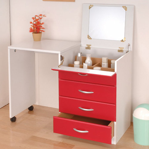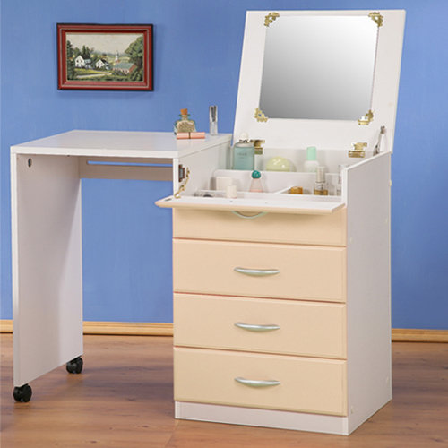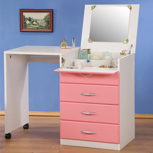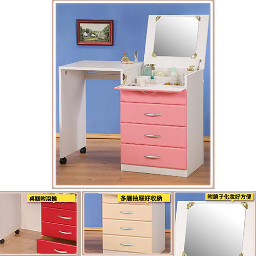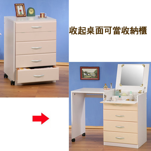 (1) 外型看似一個四抽收納櫃,將活動桌板往左拉開後即變身書桌或化妝桌櫃,讓您化妝時有足夠的桌面可使用,有再多化妝品與道具也不怕!