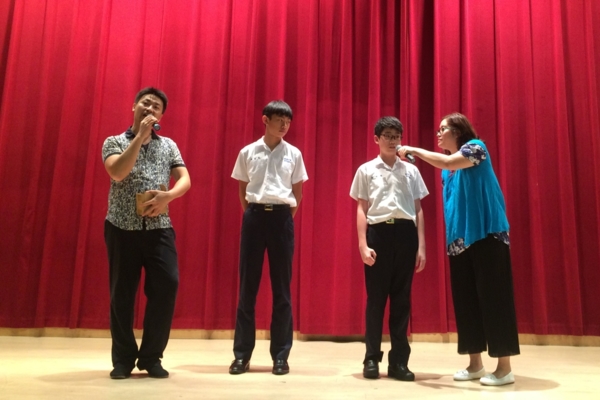 來到男校「徐匯中學」,孩子看起來比較害羞,今天宣導反毒相聲「神仙遊」。