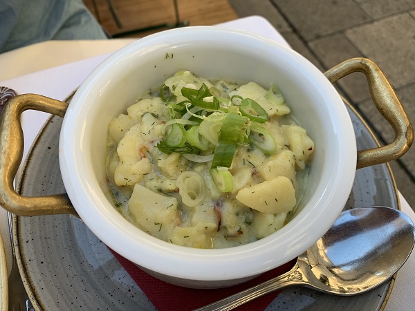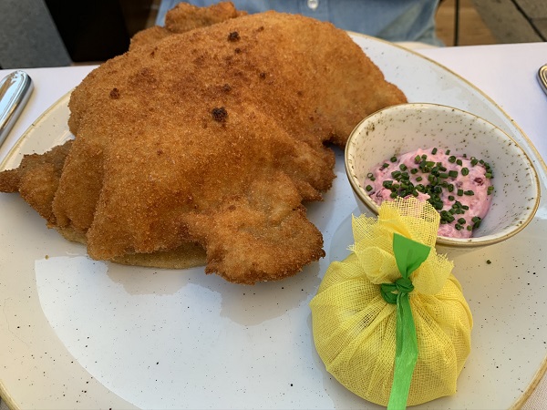 另一道主菜是monacle上說的,全慕尼黑最好吃的schnitzel 啦,搭配的是馬鈴薯沙拉跟自製紅莓-辣根醬(cranberry-horseradish sauce)。首先,要先提一下schnitzel達人的評判標準,就是皮,因為麵衣在炸完後的表現基本上影響了這道菜的評價!達人的最受是Morano 一家小店的schnitzel,他說,這皮端上桌時一定要膨,皮肉基本上處於一種分離的狀態,而一刀切開時,在視覺上需要有熱氣排出時,皮展現那種先高後低的動態感,肉當然得又薄又嫩啦,再者醬也是評量很重要的一環,因為炸物的油膩靠的就是做的美味且搭配得宜的醬來平衡了。而辣根展現出來的清爽跟紅莓的酸甜,如果做的好,絕對在進食時會讓人覺得相得益彰;除此之外,建議絕對要選馬鈴薯沙拉,因為做的好吃的馬鈴薯沙拉的酸度跟綿密的口感,絕對是炸物重要配角不二的選擇。而很令人開心的是,這家店schnitzel的表現就如同上述,所以,的確是值得稱讚的一道主菜,只是本人覺得其實年紀大了,胃也變小了,吃魚還算剛好,但schnitzel 就有點多了!