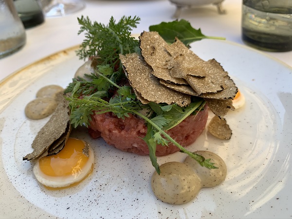 前菜的部份,我們點了巴伐利亞韃靼牛肉(Bavarian beef tartare),這是什麼呢,就是巴伐利亞式的生牛肉,老實說,在吃這道菜之前,最令我印象深刻的是巴黎Lipp吃的le tartare de beouf,但是在吃了第一口這道菜之後,這種巴伐利亞的韃靼牛肉現在是我的beef tartare中排名第一位,他們的牛肉跟法國的相比,絞的更碎,但吃起來的口感新鮮且柔軟,配上旁邊可愛的鵪鶉蛋與給的超慷慨的黑松露,每一口肉合著黑松露一起吃,感覺自己像是在貴族的餐桌上享用美味精緻的料理,吃完了之後仍然回味無窮。如果是還沒有嚐試過這道料理的人,這間餐廳的這道前菜絕對是一個好的開始;而對於喜愛這道料理的人來說,除了咀嚼時不像法式那樣的口感外,絕對是令人心情愉悅的一次嚐試。在用餐的過程中,我唯一的想法除了感動及好吃之外,就是,如果住在這裏,我願意午餐時間就來點道beef tartare,吃了可以有一天的好心情。