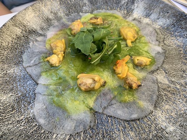 另一道前菜,是monacle上推薦的鮟鱇魚生魚片配金星蛤蜊,淡菜高湯跟火箭葉(Carpaccio of monkfish)。這道菜色也非常的特別,因為生魚片基本上完全不像法國做熟成的處理,而是像亞洲的生魚片,而所謂的金星蛤蜊其實世界上不下500種,在台灣最常看到的就是海瓜子,可想而知,蛤蜊的味道非常的香也很濃郁,配上淡菜高湯,雖然魚本身的味道清淡,但是整體的搭配鮮香,在放入嘴中咀嚼時,有種海就在旁邊的感覺,大獅是很喜歡這道前菜,不過,或許是因為我的標準是Murice,所以總覺得差了那麼一點(好吧,跟米其林三星餐廳比較,可能有點太嚴格了!)
