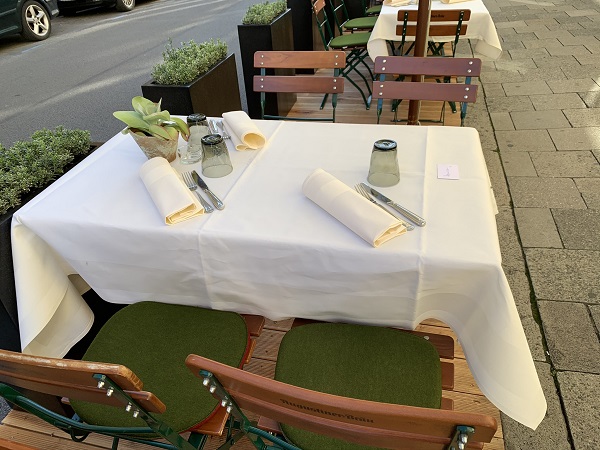 首先,我是個旅遊規劃無用人,所以當然這家餐廳不是本人找的!還好我們家有個同樣愛吃的大獅,所以他以嚴肅的心情認真的尋找後(其實是來自已經好幾年不間斷地訂閱Monocle),決定了這個行程。根據當事人的陳述,真正的原因是這家店可以喝到各種德國各地跟奧地利的Riesling,還有全慕尼黑最好吃的schnitzel(維也納炸小牛排),而這是大獅最愛菜色之一。還有一個原因就是monocle的推薦基本上還蠻值得信任的。不過,令人驚喜的是(也就是回來查詢後發現)這間是2020米其林德國的推薦餐廳。這家餐廳主要提供的是巴伐利亞菜色,而處於德國南邊的慕尼黑就是過去巴伐利亞王國的一部份。 這間餐廳離榖物巿場走路約10分鐘就到了!因為在疫情期間,我們完全沒有機會欣賞這家店的傳統裝璜,而是坐在室外。
