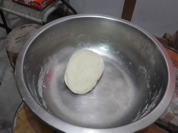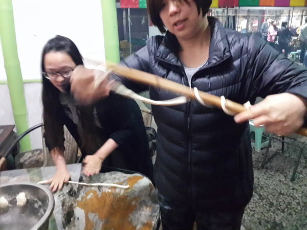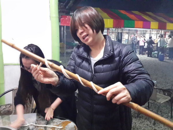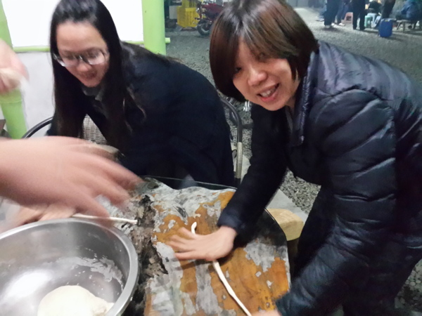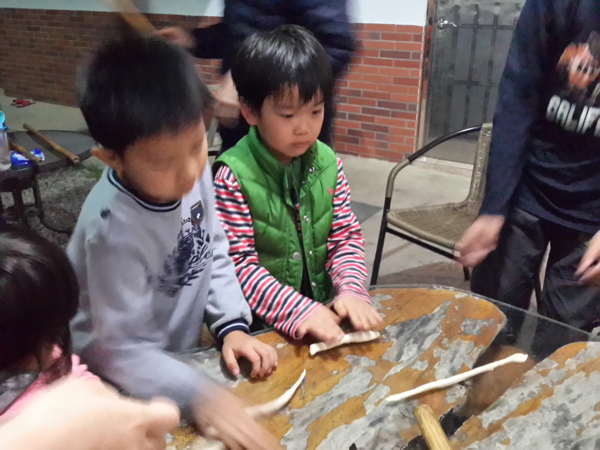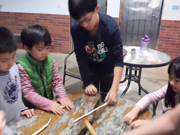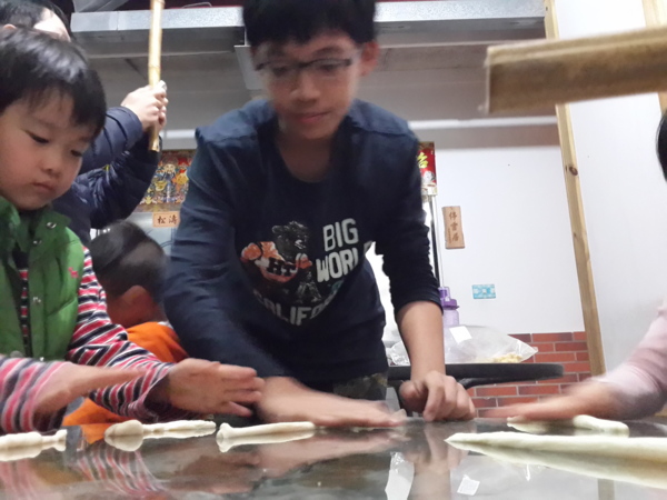 等待的時間總是一下子就過了,哈哈這不是做菜頻道的用語嗎,麵糰也經醒好了準備做蛇餅了.每個人取一小麵糰開始搓揉讓麵糰變成長條型,彥良當然是小老師.