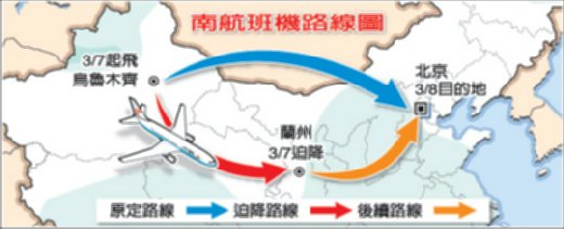 這架編號CZ六九○一的波音七五七型南航班機是三月七日早上十時卅五分起飛,十二時四十分緊急降落在蘭州,翌日、三月八日已飛抵北京。
