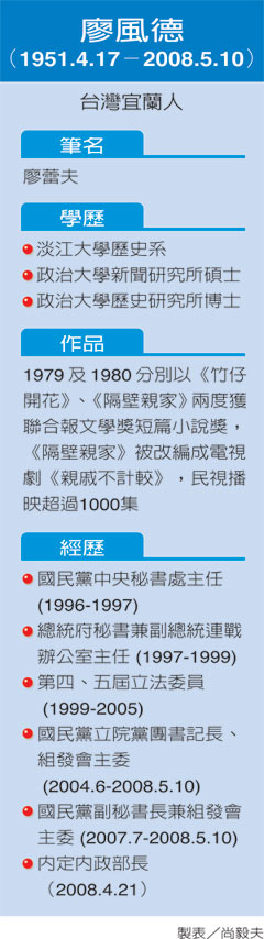黨務高層回憶說,上周中常會時,發現廖風德氣色很糟、也變瘦了,推測廖接掌部長後,承受很大的壓力,豈料,如今竟是天人永隔。