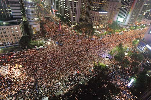 數十萬南韓民眾手持蠟燭,十日晚間在首都首爾市中心遊行,路線包括總統府和美國大使館。群眾高喊李明博下台,要求廢止美國牛肉進口協議。