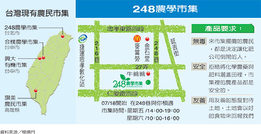 去年,台灣中部成立「合樸農學市集」、中興大學的「興大有機市集」,南部有社區大學主導的「旗美農民市集」;如今,北部再出現「248農學市集」,台灣農民市集的網絡逐漸成形。