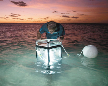 | 「熱帶昆士蘭博物館」的工作人員利用點亮的水族箱在昆士蘭州東岸的蜥蜴島珊瑚礁觀察幾個樣本。 路透 |