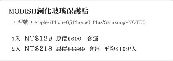 商品訊息簡述: 平均每入最低只要109元起(含運)即可購得MODISH鋼化玻璃貼1入/2入,適用機型:Apple iPhone6/Apple iPhone6 Plus/Samsung NOTE5。