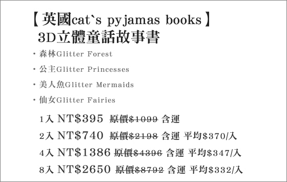 | 英國cat`s pyjamas books-3D立體童話故事書-3D立體造型插畫,英國知名童書邀你一起進入夢想世界!悠遊美人魚繽紛海底,歡樂奇妙的森林探索,小孩超愛平均每入最低只要332元起(含運)即 售價:332 我要購買 |