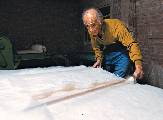 在後壁鄉菁寮老街旅遊,走進一家不起眼的製被行。在棉絮飛揚的房間裡,有位高齡的老伯專注地製作手工棉被。