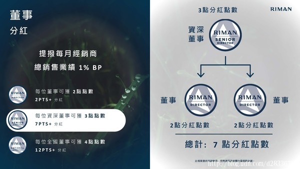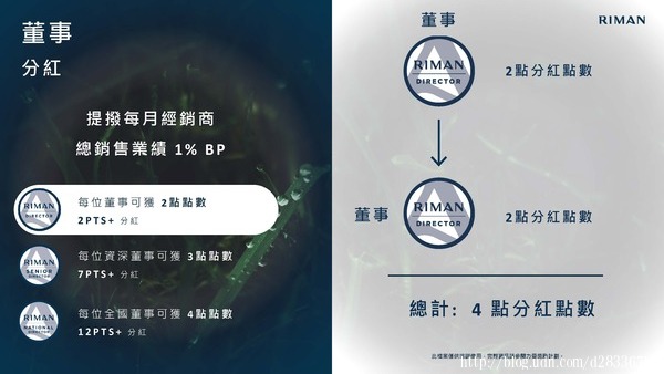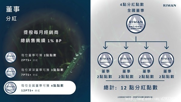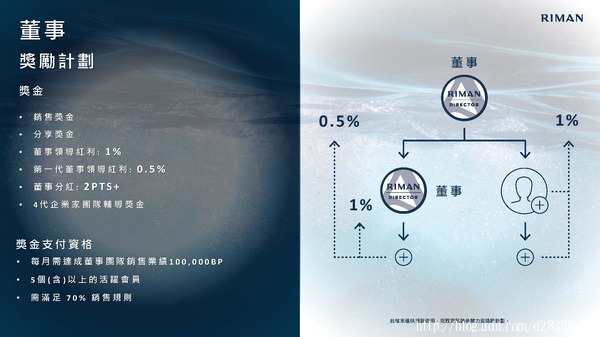 • 來自於董事組織中,各位階無限代個人銷售獎金10%~35%的差額