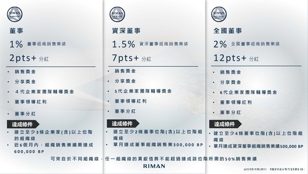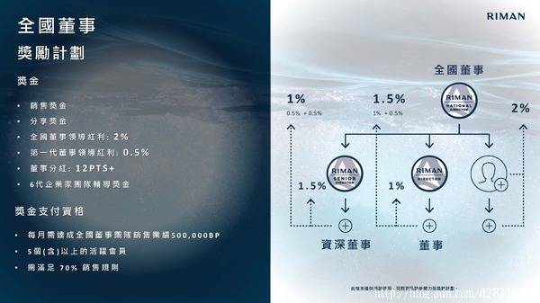 • 可領取第三代企業家輔導獎金10%(計算基礎為第三代企業家所領取分享獎金加上個人銷售獎金之50%)