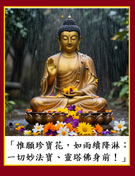 願以今日珍寶花供、妙法寶供、心雨供養之功德,迴向一切有情永離痛苦、常住清涼安樂。願善德之花不斷綻放,願慈悲之雨無盡降臨,願佛法之光照亮我心與世界。
