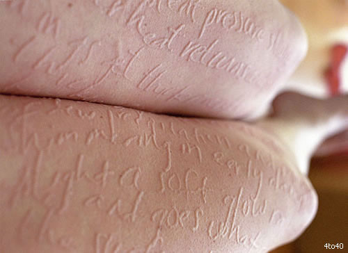 皮膚劃紋症(dermographism) ─ 基於有些風疹患者對壓力較敏感,您要是用指甲在他的皮膚上「寫字」,過數分鐘後他的皮膚有關部位就浮現出那個字了!