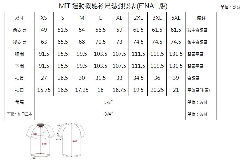 報名28天後無法取消名額與退費。 - 十七、機能性運動紀念衫尺寸參考表: