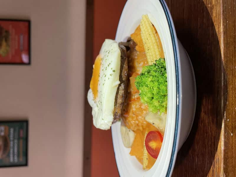 不止我,同行的朋友們也吃得非常滿意。他們點了塔香豬肉漢堡排飯和夏威夷漢堡排飯。塔香豬肉漢堡排飯用九層塔為基底,豬肉漢堡排的Q彈多汁和九層塔的獨特香氣結合得非常完美,真是讓人驚艷。而夏威夷漢堡排飯的醬汁給得超多,用料實在,每一口都能感受到滿滿的誠意。