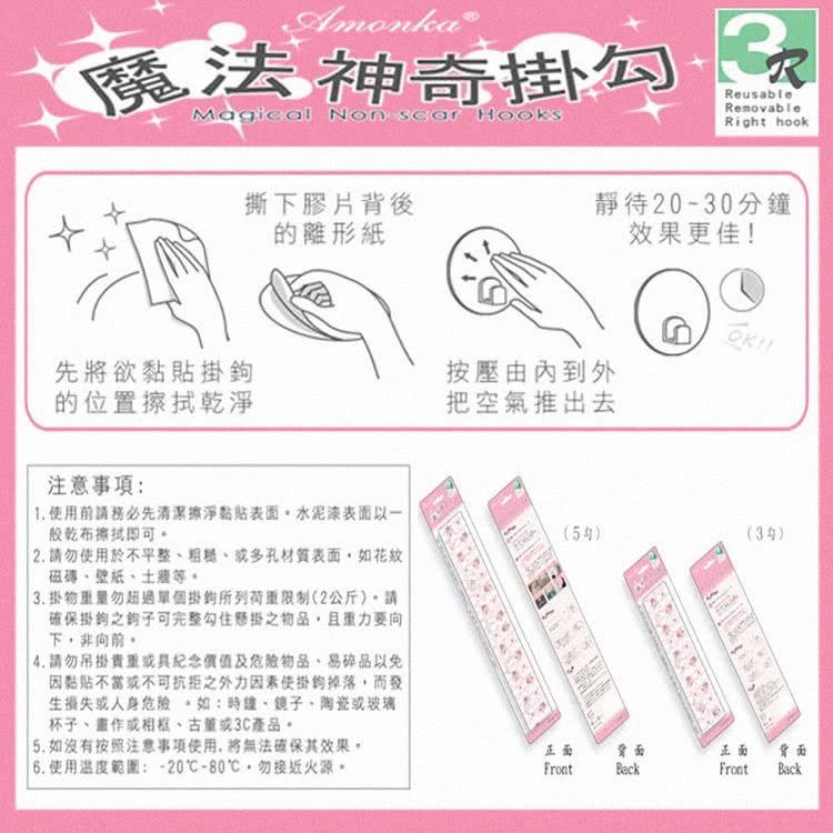 「AMONKA」3R神奇無痕掛勾系列商品,您還在使用傳統式吸盤及雙面膠掛勾嗎?「AMONKA」為您提供市場上超夯、超環保、超好用商品-神奇無痕掛勾,本產品擁有專利設計且嚴格的生產流程控管,「AMONKA」3R神奇無痕掛勾系列產品Reusable(可再度使用的)、Removable(可移動的)、Right-hook(正確掛勾),無痕免釘、不需要膠條或輔助貼片,不會破壞裝潢,可多次重覆使用,輕易黏貼不黏膠,不怕錯貼,防水-可黏貼於浴室使用,可耐水沖不易掉。典雅時尚品味設計,讓生活更添加一份浪漫的氣息。多功能使用個性化商品數量有限、欲購從速!…心動不如馬上行動 ???????