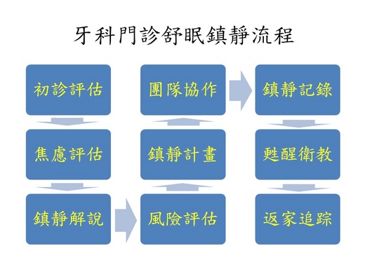 從2011年9月1日起,我先為當代牙科門診鎮靜第一梯次培訓班的牙醫和護士助理們,開啟了如下的十堂課:(一)Patient assessment and treatment planning-ASA分級,焦慮評估,適切的鎮靜計劃與評估指標;(二)Emergency medicine and management in dentistry-設備與人力,BLS/ACLS急救團隊與後送;(三)Anatomy, physiology, principles of pharmacology-鎮靜狀態下的呼吸、吞嚥與保護機制其常用鎮靜藥物學理;(四)IV setting & TCI/propofol Demo-靜脈留置針與TCI/propofol不同鎮靜深度示範操作;(五)Monitoring and assessment of vital signs-生理監視器裝置與資料判讀;(六)Inhalation N2O and midazolam via intranasal & intravenous routes Demo-鼻吸笑氣與鼻滴/靜脈注射midazolam與拮抗劑(flumazenil)操作示範;(七)Alternative sedation techniques-牙科門診操作TCI/propofol的鎮靜學理與侷限;(八)Relative Analgesia-NSAIDs (非類固醇抗發炎劑)& narcotics (麻啡類止痛藥)在牙科門診鎮靜的適應症與禁忌;(九)Paediatric sedation techniques-學齡前兒童牙科鎮靜案例示範;(十)Communication among dental sedation team staffs-牙科門診鎮靜團隊的溝通與協作。目的是為了讓牙醫診所的醫護同仁瞭解牙科門診鎮靜的整個流程(圖上)。此外,我也為Abc牙醫聯盟開辦牙科門診鎮靜的基礎班-四堂課,內容參照當代培訓班的第(一)、(二)、(三)和(五)堂。