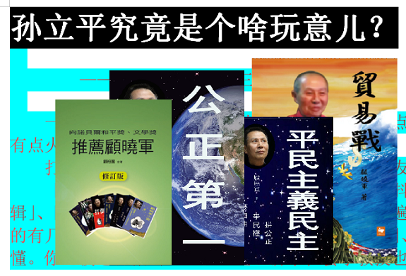 我壹看,將孫的〈世界上在發生什麼——四個有意思的提法〉找來研究,發現:他何止把我的《平民主義民主》的精髓送給班農?孫立平是把我社會學著作《平民主義民主》、《公正第壹》和經濟學著作《貿易戰》中的精華,全都拆拆,分派給了其他人。