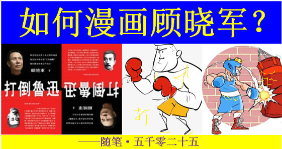 然,这些与漫画都不太搭。而作为一网红、行为艺术家(姑且这么说)、键盘侠……我顾晓军,则有——「顾晓军小说」、「打倒鲁迅」、「狂挺邓玉娇」、「批邓理论」、「顾门子弟」、「爆料王立军」、「顾粉团」……这些,都各有千秋,很难说哪个就比哪个更火;而若要从多年以后,后人们一眼就能看明白的角度来说,自然是「打倒鲁迅」更合适。