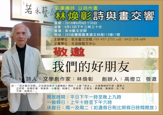 詩人林煥彰以詩的語言結合繪畫,呈現在故鄉宜蘭的土地上。即日起在宜蘭縣羅東鎮的「若水藝文空間」展出至三十日,茶會十三日下午三時三十分,在羅東鎮文林路110巷11號。電話:0932-258-689、03-957-2753。