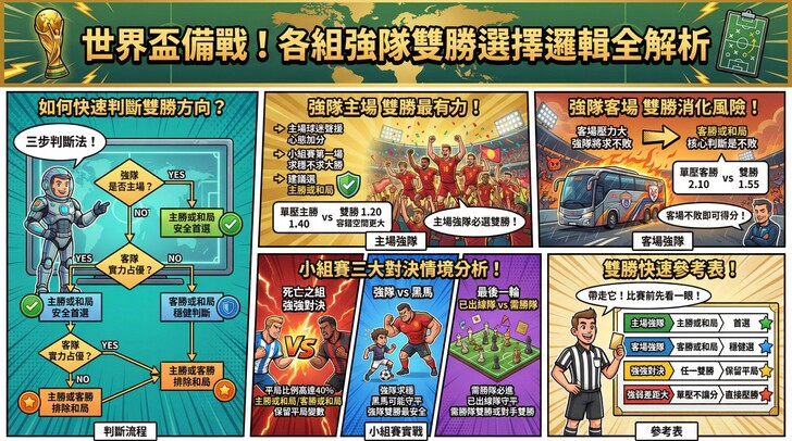 在世界盃小組賽、聯賽焦點戰、客場強隊作戰時,雙勝往往能提供比單壓勝負更穩定的判斷框架。