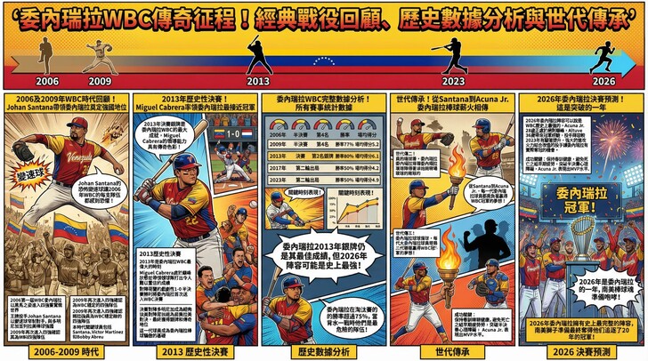在世界棒球經典賽(WBC)的版圖中,委內瑞拉代表隊始終是拉丁美洲最令人畏懼的棒球強權。這個南美洲國家被譽為「MLB 的人才搖籃」,從傳奇 Miguel Cabrera 到現役巨星 José Altuve,委內瑞拉球員的身影遍布大聯盟各支球隊。委內瑞拉隊曾多次闖進四強,並在 2013 年創下決賽紀錄,展現出足以與美、日、多對抗的頂尖競爭力。本文將帶您深度解構委內瑞拉的明星陣容與戰術風格,並提供 2026 年最完整的觀賽指南。
