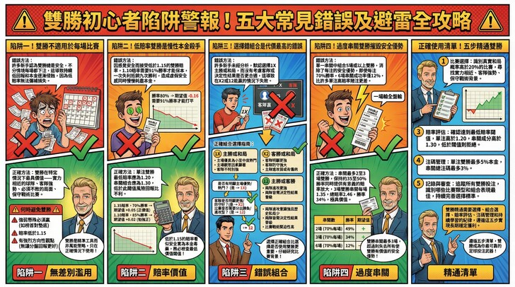 專家建議: 若賠率過低(如 1.10 以下)則失去投注價值;最理想的雙勝進場點是在兩隊實力接近、且「和局」賠率處於低位時,利用雙勝鎖定利潤。