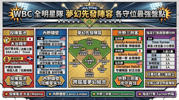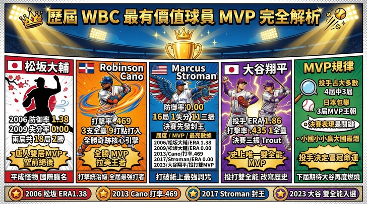 每當世界棒球經典賽(WBC)的號角響起,全球棒球迷的熱情便會瞬間被點燃。這項賽事不僅是國與國之間的對抗,更是各國職棒英雄脫下球團制服、披上國家戰袍的巔峰對決。而每屆賽事落幕後,官方評選出的「全明星隊(All-Tournament Team)」名單,不僅是對球員個人數據的肯定,更是對那些在關鍵時刻燃燒靈魂、扛起國家榮譽的英雄們最高的致敬。今天,我們將以資深球迷的視角,結合精確的歷史數據,帶您回味從 2006 到 2023 年,那些讓全球轉播畫面都為之震動的經典傳奇。