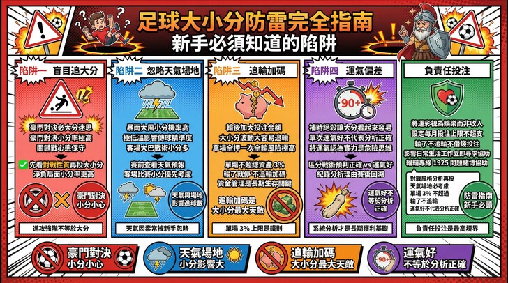 避開過度串關: 由於進球數受偶發事件(如紅牌、點球)影響巨大,串關時建議大小分不超過三場,並搭配相對穩定的勝負盤,以分散單一意外事件帶來的風險。