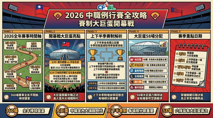 2026 年中華職棒(CPBL)第 37 年賽季,於 3 月 28 日 在台北大巨蛋正式點燃戰火。本季不僅延續了六隊競爭的激烈態勢,更在全台首座室內棒球場安排了高達 58 場 的例行賽,徹底改變了台灣球迷的觀賽習慣。從春天的熱血開幕到秋天的台灣大賽,全季 360 場賽事將為球迷帶來不間斷的棒球盛宴。本文將為您解析 2026 年的完整時間軸、獨特的半季賽制,以及最聰明的免費觀賽管道。