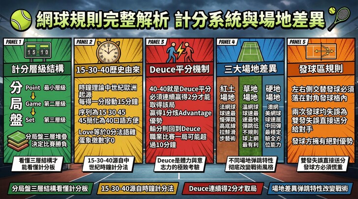 網球被譽為「紳士的運動」,其規則看似繁瑣,實則蘊含深厚的歷史底蘊與公平性邏輯。為什麼計分不是簡單的 1、2、3?為什麼落後一盤還能反敗為勝?理解網球規則,不僅能讓您看懂比分板上的數字,更能體會球員在關鍵分(Big Points)時的心理壓力。本文將帶您從最基礎的「分、局、盤」層級出發,深入探討場地特性、術語美學及決定勝負的搶七機制。