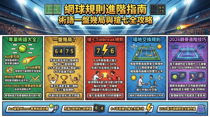 觀賽總結: 下次觀賞比賽時,留意計分板上的 Break Points(破發點)。那是全場壓力最大的時刻,也是頂尖球星展現王者氣場的瞬間。掌握了這七大規則核心,您就能更深刻地感受網球這項「指尖上的博弈」!