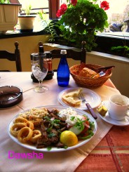 點羅德斯拼盤(Rodos Plate)。這個拼盤裡有炸花枝、烤羊肉、沙拉等。花枝炸得外脆內嫩。羊肉則烤得太老,且筋多不好嚼。盤邊的沙拉不錯吃。再加上餐後咖啡一杯,這餐吃下來13.5歐元。這家餐廳是家庭式,服務親切,它位在公園旁,外面的用餐環境比裡面好,結帳後老闆端來一杯綠得嚇人的飯後薄荷酒給我,很甜。