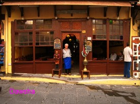黃昏時,在住處附近的這條最熱鬧的商店街Socratous街閑晃,遇到一家土耳其咖啡店,老闆人很好,要我入內參觀,並且拿出簽名簿給我看。原來這家店吸引了不少客人,其中還有許多來自世界各地的華人,雖然同樣用中文書寫但就是很不相同,一個一個解釋給他聽。