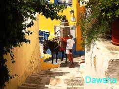 今天下山時,路上巧遇送貨的驢子,這個運送系統已經維持了好幾個世紀。相片中驢子所站的位置是紀念希臘著名的藍調歌手Markos Vamvakaris的小博物館與紀念碑。由這裡再往下走,你可以看到一個公廁的指標,它維持得不錯,算是乾淨的公廁,但沒有提供衛生紙,需要大家自備。