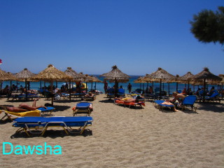 至於我們四人來這裡做什麼呢?享受天堂?解放我們的肉體或是眼睛?實際上,就是走著瞧隨興而為。今天的太陽特別毒辣,原本放入包包的泳裝,完全無法派上用場。北歐人在太陽底下越解越多,我們在太陽底下越包越緊。就這樣四人以走埃及沙漠的裝扮,踏上天堂海灘。我們的妝扮,讓躺在海灘椅上多時的遊客,有了新的可以聊天的題材。也算是一種貢獻。