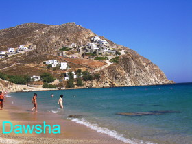 而當車子抵達總站時,真正進入天堂的遊客很少,只見一群辣妹、老夫妻檔而已。其餘的年輕人男男一組組地往旁邊的小路走去,那裡難不成是傳說中前往超天堂海灘的捷徑嗎?咦!她們人呢?東找西找終於在車站的小店發現她們的影子,原以為她們第一站就要淪陷在此,幸好只是看看。各位看官這裡的東西超貴的,海灘鞋比我在Syros買的貴一倍多,並且材質差又難看。價格比較實惠的反而是天堂海灘內的小舖子,Wang在這裡買了一條頭巾。
