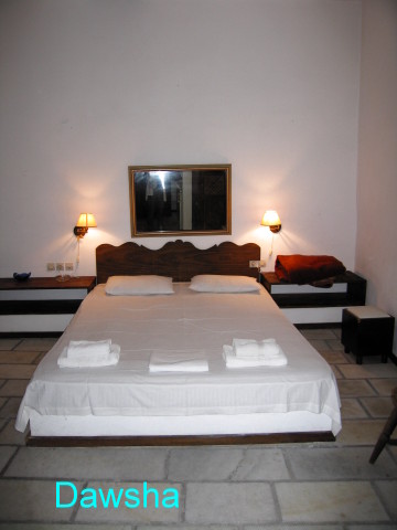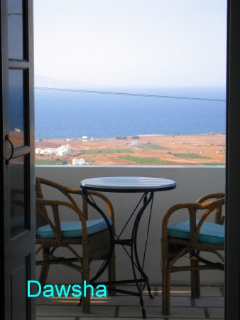 話說這兩位老實人一看到我們房間一直讚嘆,房間棒、設備齊、View佳、價格又比他們便宜等等。只是看到我們樓上的雙人床兩人就沉默不語,一直到門口才說需要考慮一下,還是先去上網查一下好了。大俠心想兩個男人可以共乘一輛機車,但要共睡一張雙人床恐怕是個考驗,他們大概不好意思說吧!果真一個小時以後他們來敲我們的門,他們已經訂到費拉(Thira;Fira)與我們同旅館的三人房兩天住宿,以及CRETE島與我們同旅館的兩天住宿。看來我們注定要好好的享受一下我們寬敞的空間了。無需四人擠一間了。