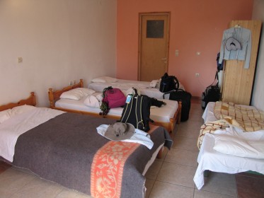 再加上外面車聲不斷,並且許多時候是重量級的砂石車,震得我們房間轟轟響,整個晚上我們四人都沒睡好。第二天早上7點多我們四人全起來了,此時浴室的燈泡又壞了,裡面一片漆黑。Chen與大俠決定要打包換房間。要利用早上客人最多的時候,與他們談。決不讓自己像在Naxos一樣,在沒有客人的時候,任他們仗著人多勢眾,欺壓我們。Chou與Wang附議。