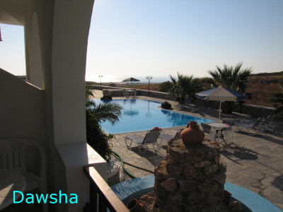 他們在網路上預定這家旅館號稱是三人房。當他們抵達時,卻被載到東海岸離費拉(Thira)有段距離的海邊。房間簡陋。由於房間比他們之前租的便宜,也比較近,以及他們本來就想待在海灘玩水,又有摩托車出入對他們就不成問題,也就沒有要求要換房間。沒想到她居然想讓我們去住那裡,幸好我們堅持才能留在交通比較方便的本館。