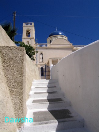 新建築的房子則建立在山坡上。我們發現這個小村落的居民熱情又純樸,這裡有一座美麗的白屋頂教堂。若你想了解真正的聖多里尼可以考慮住村裡的民宿。回程的路上,遇到三個可愛的姊弟幫他們拍了不少照片,最後還跟他們到他們家門口跟他們的父母say hello!