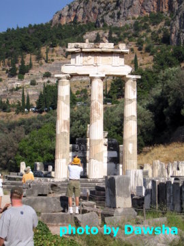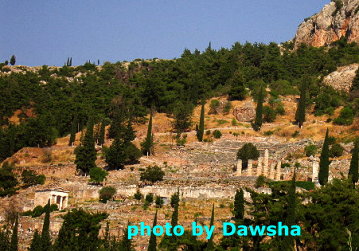 眺望遠方的神諭之地阿波羅神廟。據說在史詩中,這個神諭之地,是神諭者(Pythia)向底比斯〈Thebes〉的國王Laius宣布他的兒子(伊底帕斯)會殺父娶母的地方。這個故事後來影響著心理分析大師Freud,而有所謂的伊底帕斯情結,也就是戀母情結。