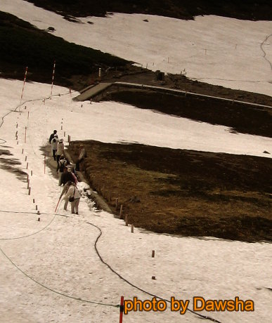 在產業道路上,我們雖然很不甘願地踏著碎石子前行,至少我們的身子暖活多了,並且遇到不少登山客,以及一群由老師帶隊來乘鞍高原進行校外教學的小學生。原來,在冰雪覆蓋的乘鞍高原的初夏,一般登山客是走產業道路,直到【肩の小屋】及東京大學的氣象觀測站之後才沿著碎石子登山步道前行。