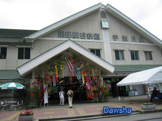 在這裡改搭黒部峡谷鉄道 http://www.kurotetu.co.jp/flash.html。黒部峡谷鉄道的起站名為宇奈月,這個鐵道的車站,就在富山電鐵的宇奈月温泉站的右後邊。