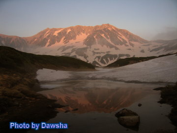 用餐之後,原本遮住山頭的雲霧,此時快速地散去,整個山頭半染成粉紅色與桃紅色。黃昏時刻是雷鳥出來覓食的時間,Dawsha立即往雷鳥出沒最頻繁的地方走去。(雷鳥出沒地,會隨著季節變動,問山莊的人最準)。